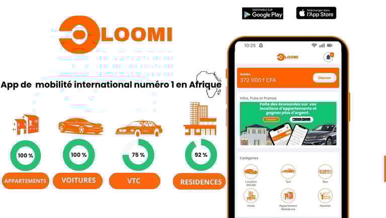Loomi est une application de mobilité internationale qui facilite la location de voiture entre particulier , la commande de taxi et de bus,